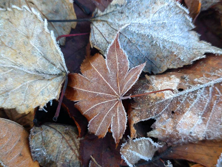 すっかり色褪せた落ち葉の葉脈が、霜でくっきりしていました。5日が「小寒」でしたから、いよいよ最も寒い季節に向かうのですね。