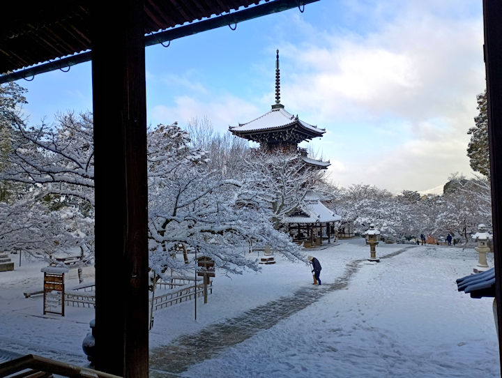 正面参道の除雪をし、本堂や廊下の雪は箒で掃き出したりしましたが、なかなか大変な作業でした。