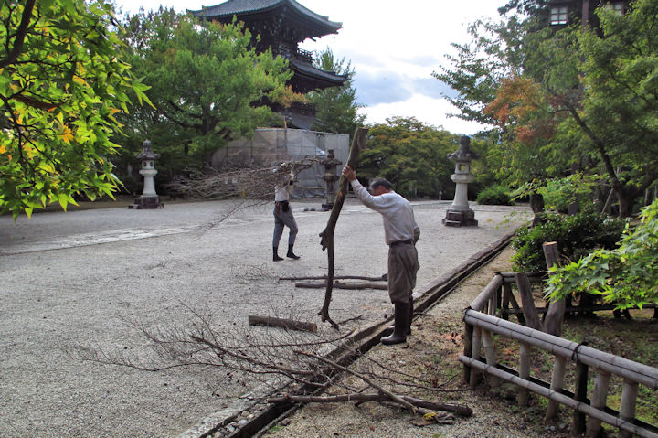 写真は杉の伐採をする植木屋さん、本坊の屋根の向こうには大文字山が見えています。