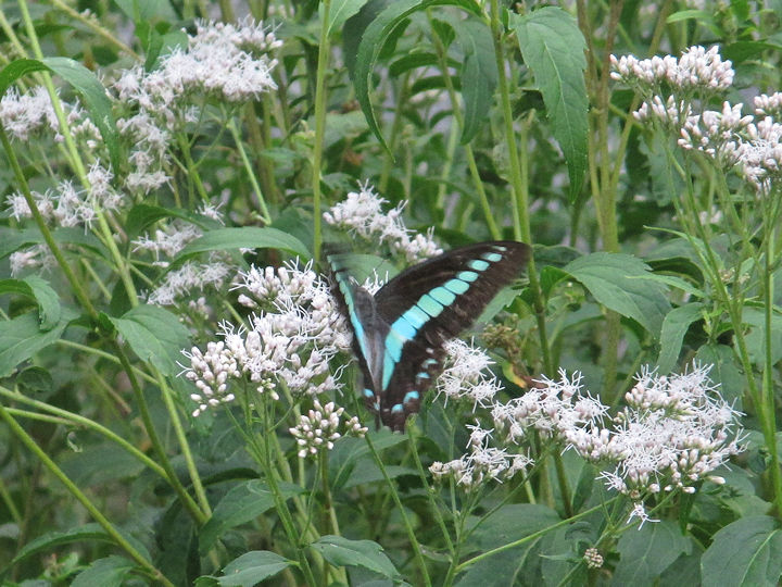 こっちは青条揚羽(あおすじあげは)。鮮やかな水色の模様が目印です。この蝶も頻繁にはやってきません。