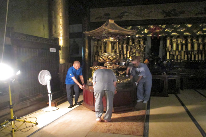 塔は、普段は裏堂の釈迦三尊像の近くに収納してありますが、キャスタ付きの台ごとゴロゴロと本堂内陣まで移動させ、灯ろうなどを置きました。