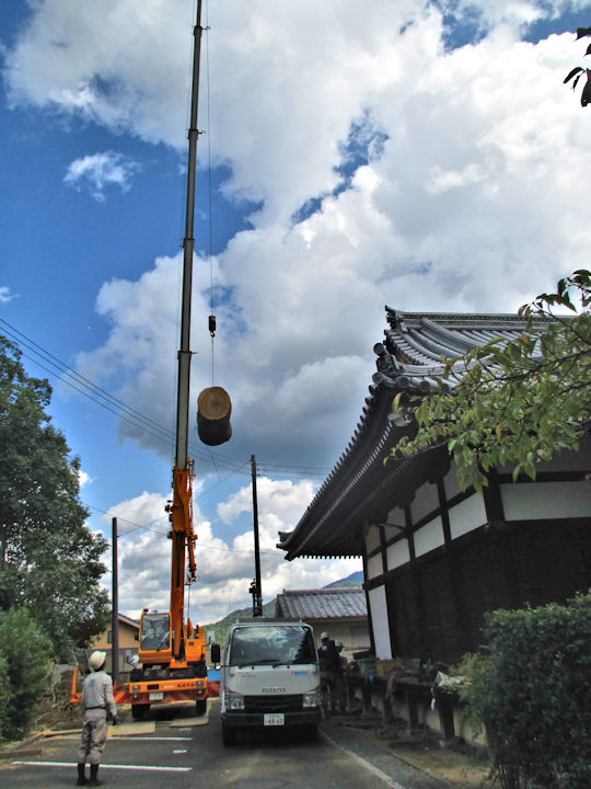 作業現場の横では、知り合いの仏師さんがレンタルの大型トラックで待ち構えていて、太い部分を積んで貰っていました。10年近く乾かして、仏像などを彫るために使ってくれます。境内で長く生きてきた木が、しばらくして仏像に生まれかわるのです。そう思えば、木の魂も許してくれるでしょう。
