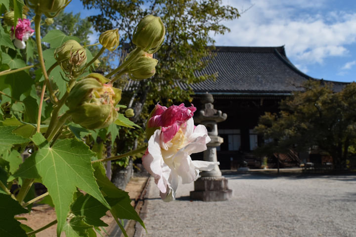 酔芙蓉の花が、本堂前の白砂のところでも咲いています。これは「くす玉」と呼ばれる品種でしょうか? 八重咲きの変種ですが、一重のほうがシンプルでいいかも知れませんね。