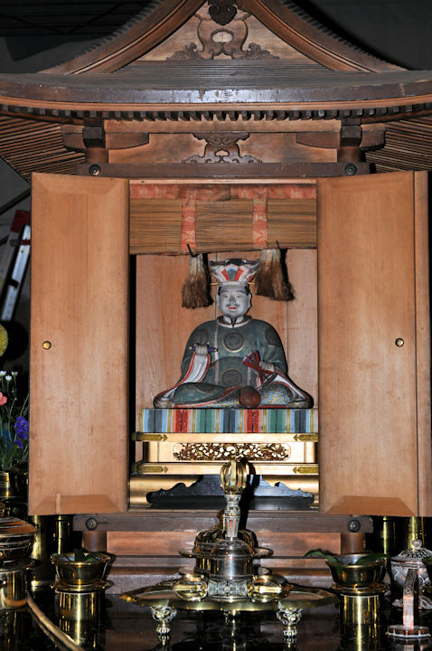 法要の間、本堂の正面には引声阿弥陀経の経巻と四菩薩を配した引声塔が、左脇檀には慈覚大師が唐より将来して常行三昧堂にまつったといわれる、念仏の信者の守護神である摩多羅神(まだらじん)が安置されます。また、右脇檀には、一度途絶えたこの法要を再興した泰門和尚(三井家3代。1748年没。泰門庵開祖)の木像と位牌がまつられます。