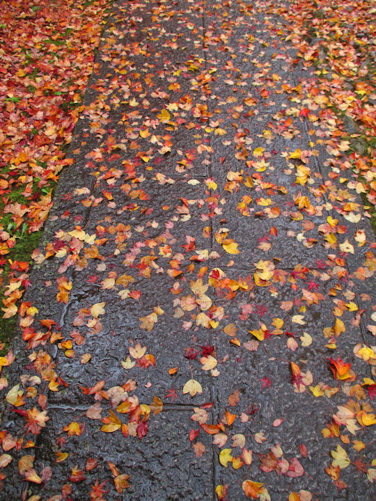 でも、雨は落葉を促しました。もみじの葉の上に、背の高い楓の葉が載っていたりと、また風情がありました。