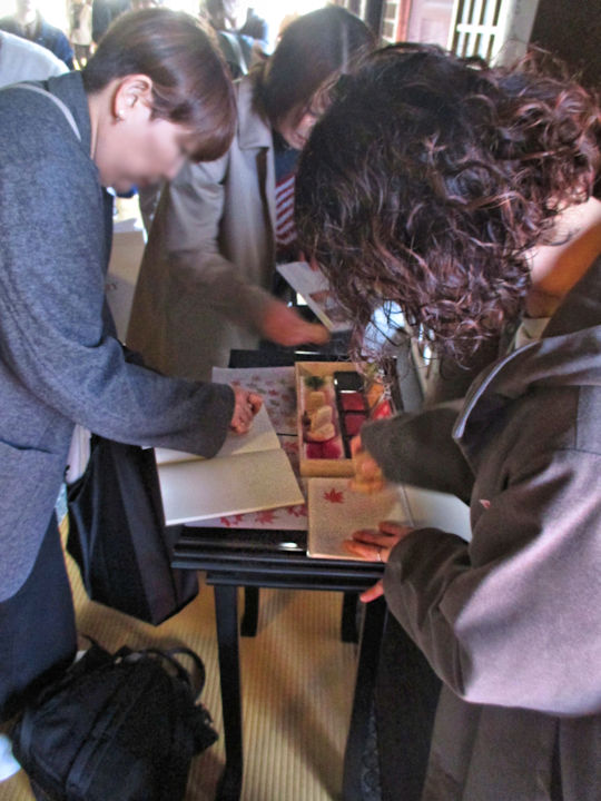 紅葉の時期、本堂外陣にはモミジなどのフリースタンプが置かれ、お参りの人が次々と押していかれます。
