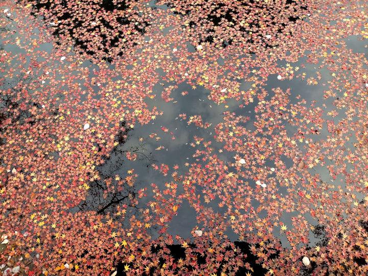 一気に落ち葉が増えて、参道が落ち葉に埋もれていたりします。池はもみじをばら撒いたようになっていて、きれい!