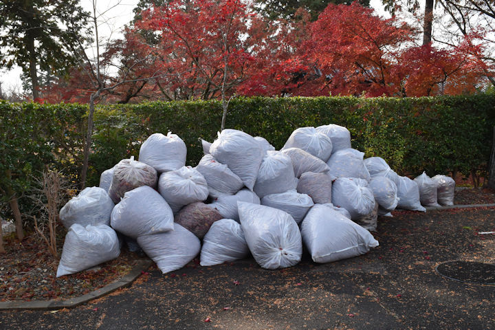 徐々に集めていた落ち葉が、結構大量に溜まってきました。かつては燃やしたりしていましたが、いまは年を通して月に2回、パッカー車で回収に来てもらっています。12月は1台では載せきれないかも知れません。