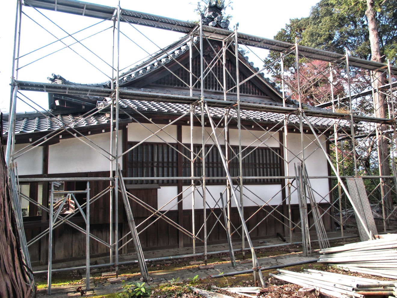今日から、『随縁の庭』の奥にある「位牌殿」の工事が始まりました。まずは足場を掛ける作業ですが、車が入る場所から現場までは60メートル余。重い足場を担いで運ぶしかありません。今年中に足場が完成するかどうかというところです。大工さんも瓦屋さんも同じなので、それだけでも大変です。桜の頃までに終わればいいのですが・・・。