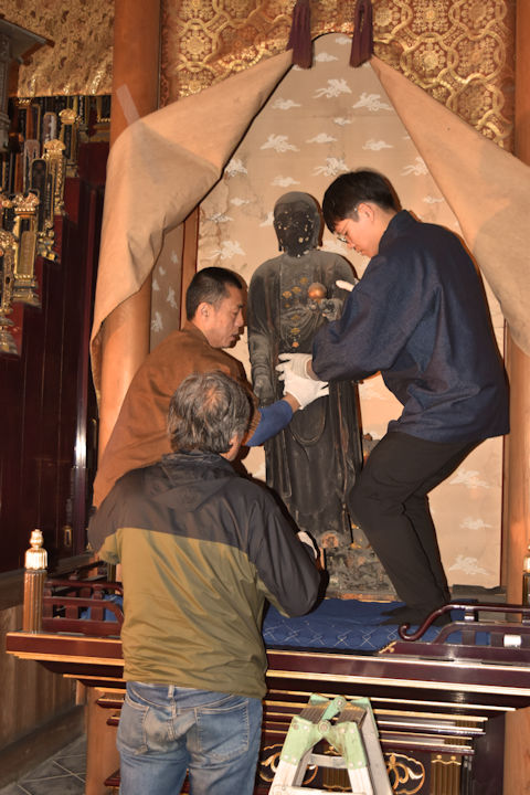 須弥壇から降ろしてみたら、お地蔵さんの本体と光背、台座は、もとはそれぞれ別々の仏さんのパーツのようでした。組み合わせて一体にしたのかも知れません。時代的にはそれほど古くはないでしょう