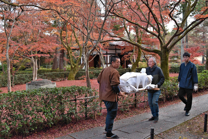 本堂の裏の敷き紅葉に囲まれた「万霊堂」。そのご本尊のお地蔵さまが、修復のために、今日、滋賀県の「近江佛所」へ向かわれました。