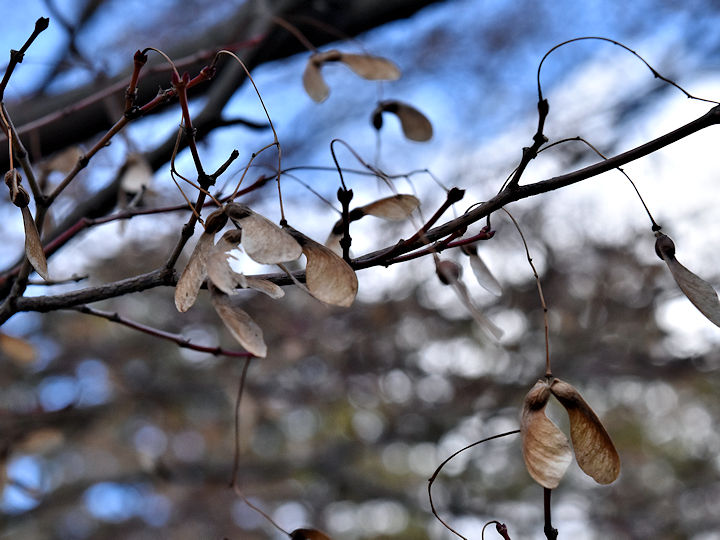 葉っぱが落ちたもみじの梢に、種がいっぱい付いているのがよくわかるようになりました。