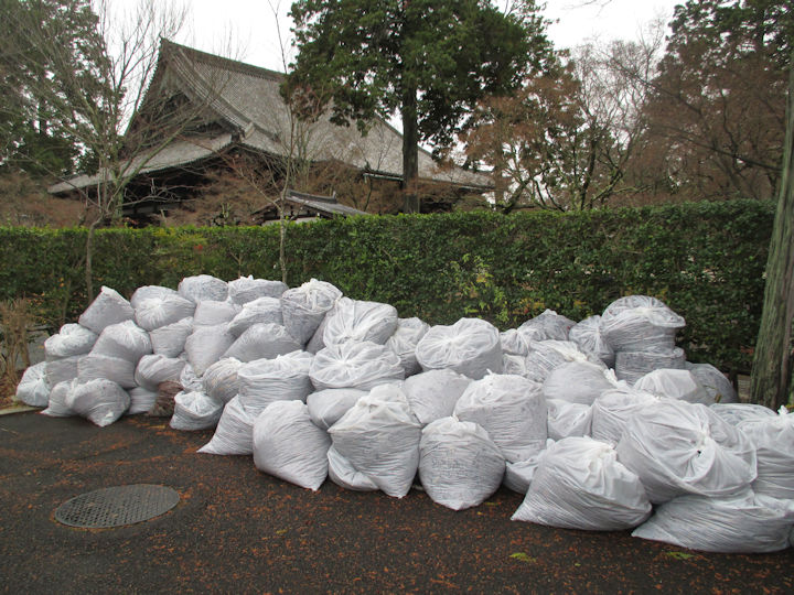 落ち葉を入れた袋が山積み! 今日は回収に来てくれたので、やっとスッキリしましたが、またどんどん溜まっていきます。