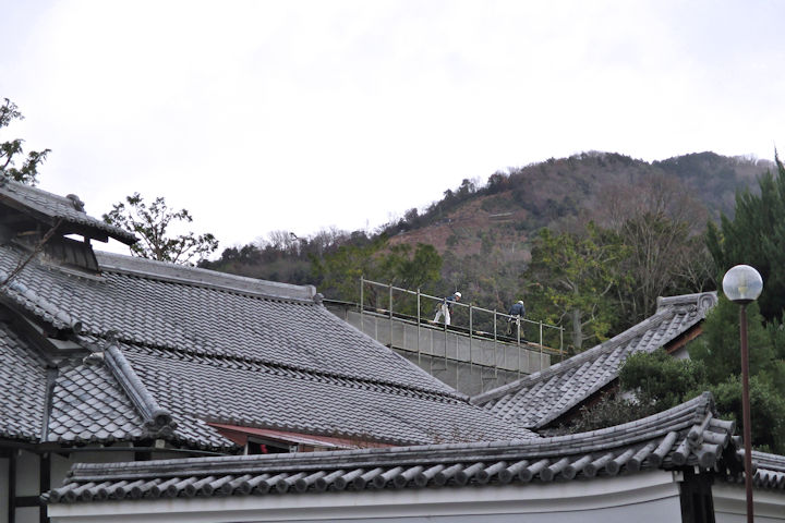 「位牌殿」の足場工事は、雨で2日間ストップし、今日も中止かと危ぶんでいましたが、職人さんが来て足場の屋根板を葺く作業をされていました。