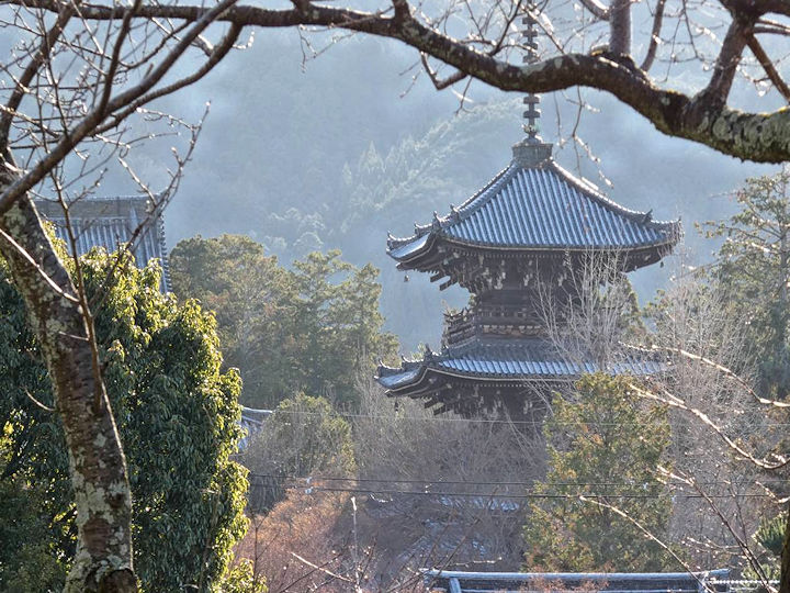 今朝は、屋根や苔の上に、ほんのうっすら雪が積もりました。積もったのは今季初めてです!
