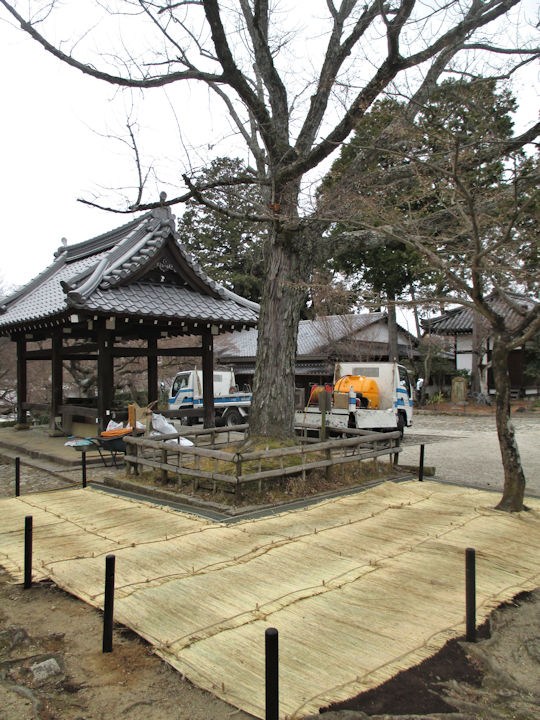 花の木の周りは、土が人に踏み固められてしまって水が染み込みにくくなり、根っこが水不足や呼吸困難になってしまっているかも知れない・・・ということで、エアレーションをして、その上にバーク堆肥などを撒き、ムシロで覆いました。