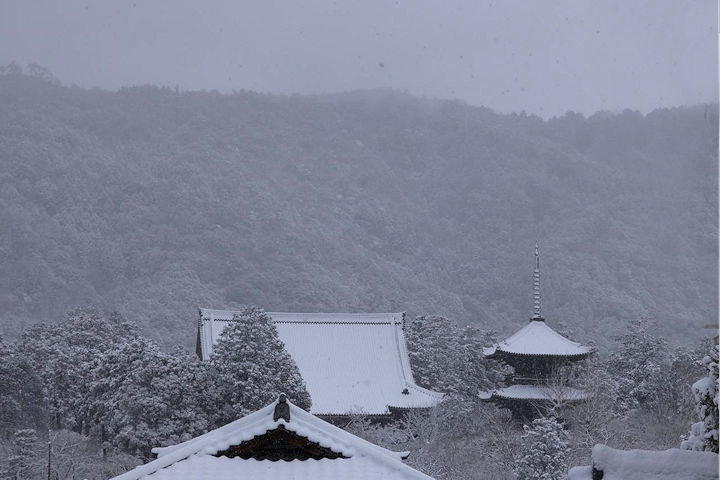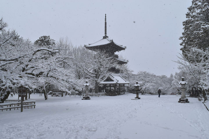 天気予報では大雪になると報じていましたし、京都府には大雪警報が出ていたので、どんなことになるかと思っていましたが、夜が明ける頃は雪はまったく降っていませんでした。ところが、8時頃からどんどん降り始め、あっという間に境内は真っ白になりました。