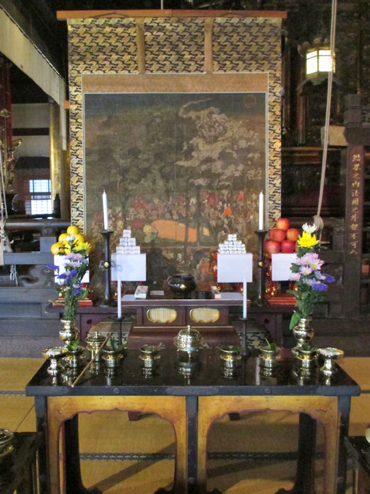 本堂には明兆作と伝わる室町時代の涅槃図が掲げられ、その前に祭壇を組んで法要が行われました。