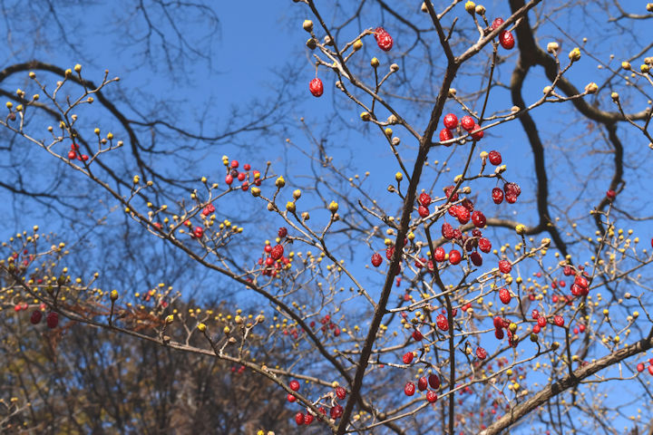 もともと山茱萸の実は鳥が好んで食べる味ではないようですが、他の南天や千両、万両の実もまだいっぱい残っています。明らかに鳥が少なくなっている影響でしょう。