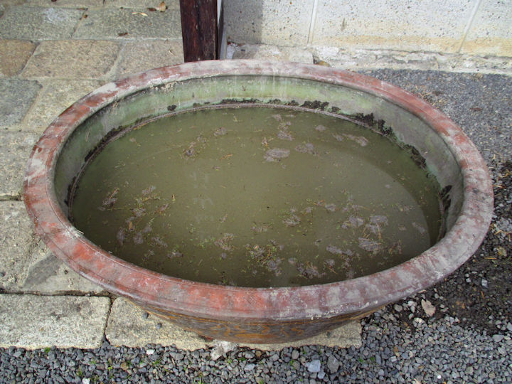 この蓮鉢の重たいこと! 植え替えるには、鉢をひっくり返して、混み合った蓮根をほぐす必要があります。水を抜き、土も半分くらいにして、3人掛かりでひっくり返して、何とか植え替えました。