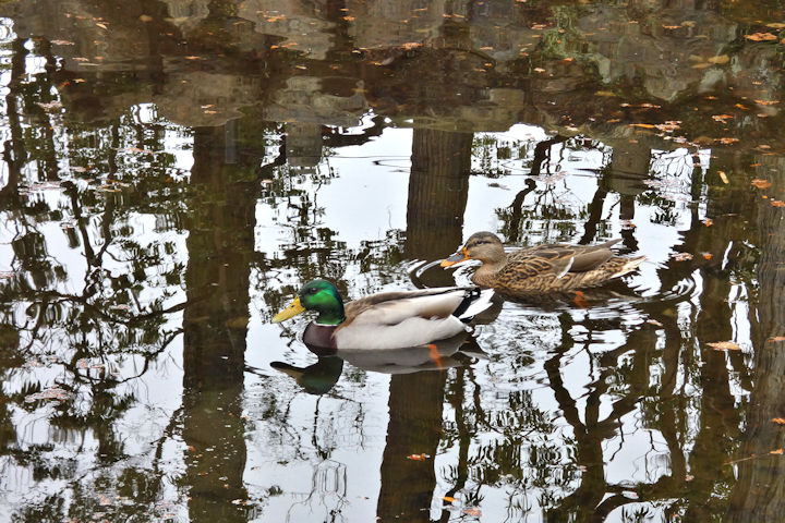 真鴨は越冬中にペアを見つけ、春には雄雌が連れ立って繁殖地へ渡るそうです。繁殖期は湖沼、池、湿地の周辺の草地などに生息するということなので、巣を作る場所を一緒に探しているのかも知れませんね。
