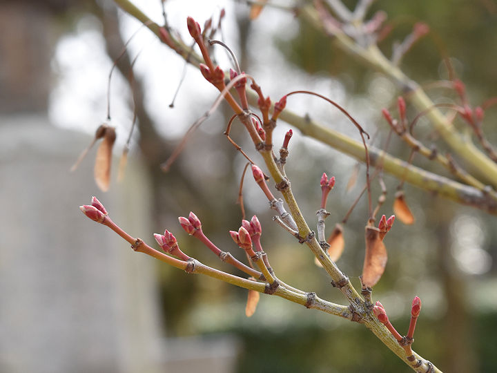 もみじの葉芽も、少し大きくなってきました。細い軸に付いているのは去年の種です。今年は去年の種が落ちずに、たくさん梢に残っています。ちゃんと成熟しなかったのかも知れません。