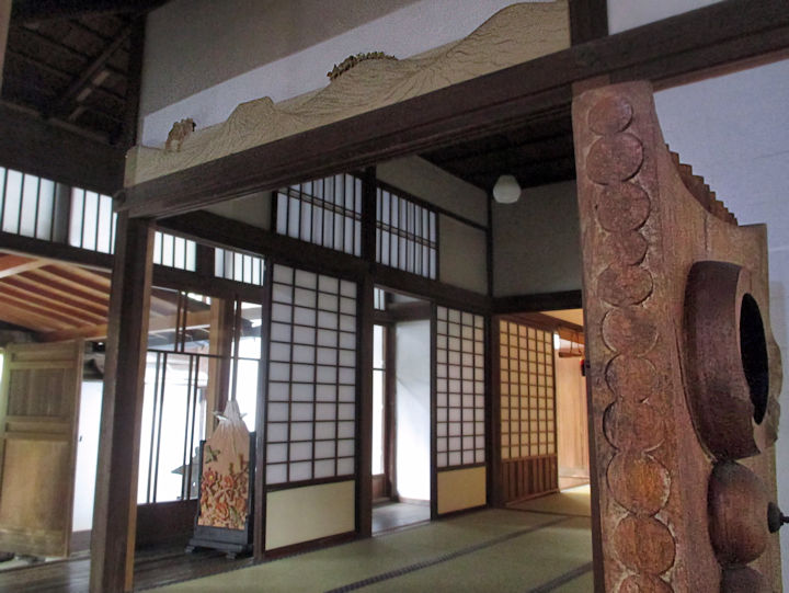 富士山と梅(左下)は書院の入り口に、大きな釘隠しの付いた作品(右端)は、裏表が見えるように拝観コースの分岐点に、シルクロードを行く旅団(写真上)は鴨居の上に、それぞれ飾らせていただきました(作品名は正式なものではありません)。