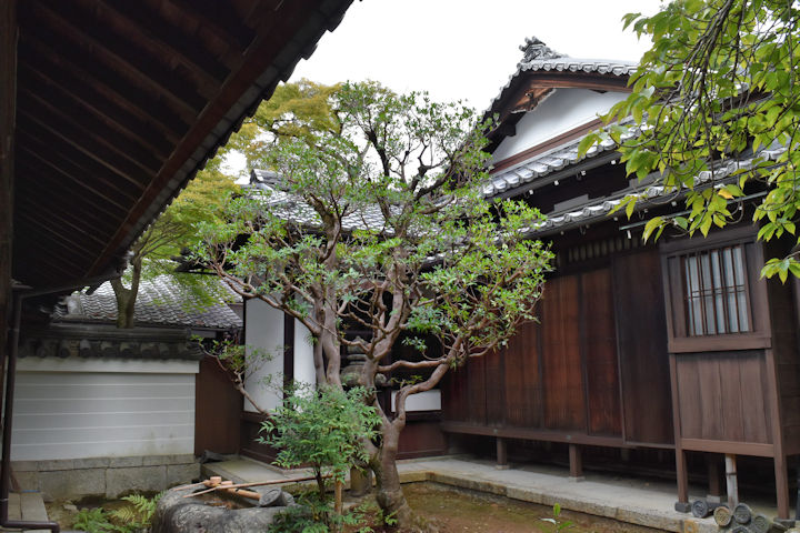 本堂から書院に通じる渡り廊下脇にあるモッコクは、鬱蒼と茂っていました。適期ではありませんでしたが、紅葉期を迎える前に僧侶が剪定しました。