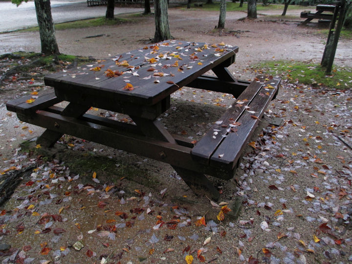 夜来の雨で、境内のベンチには葉っぱが積もっているだけで、座る人はいません。明日もまた雨のようなので、また葉が積もりますね。